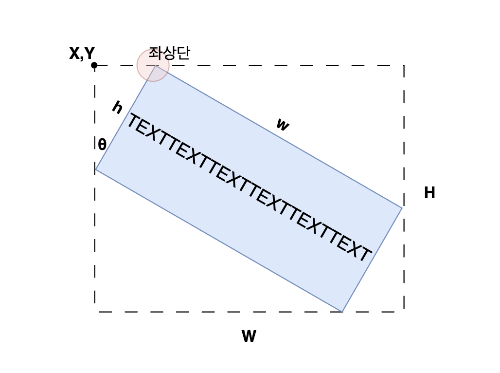 회전된 텍스트 요소의 외접 **사각형(W, H)**과 **회전 각도(θ)**를 이용해,